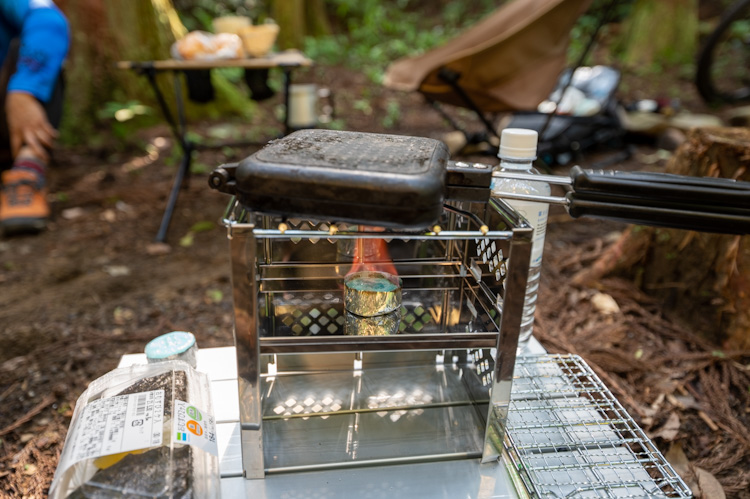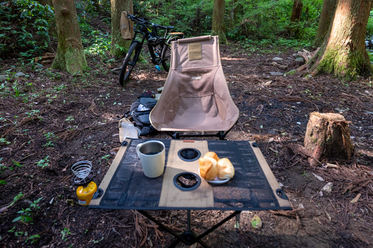 | 朝ご飯ライドも楽しそうなのでお試ししてきました。 くろまろスタートで E-Bike 自走です。 ダムを通過します。快晴です、風もありません。 湖面に山が綺麗に映り込んでいます。 朝日の湖畔を走ります。いい季節です。 道中は全て舗装路で最後のアプローチのみ下りのトレイルです。 川のそばにある杉木立の中が目的地です。 ここでのんびり朝食をとります。コーヒータイムでもいいかもしれません。 清流を眺めながら、ゆったりとした時間を楽しみます。 1時間弱滞在です。 ホットサンドメーカーで朝食を作っています。 見た目とは裏腹に中身は餃子ですが。 こちらはさばと玉子焼きを焼いています。 ホットサンドメーカーの万能さが光ります。 後ろはシェラカップで炊いたご飯にかける玉子とオクラです。 和食ですね。 パンとコーヒーも王道です。 帰りは下りなのでサクッと走ります。 ほとんど写真はありません。くろまろまで一直線です。 2時間半コースでしょうか。 |