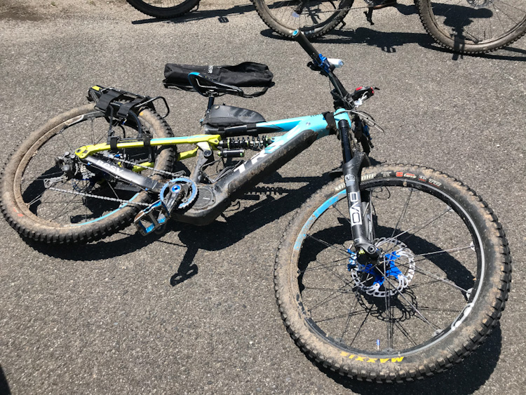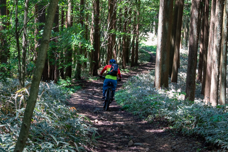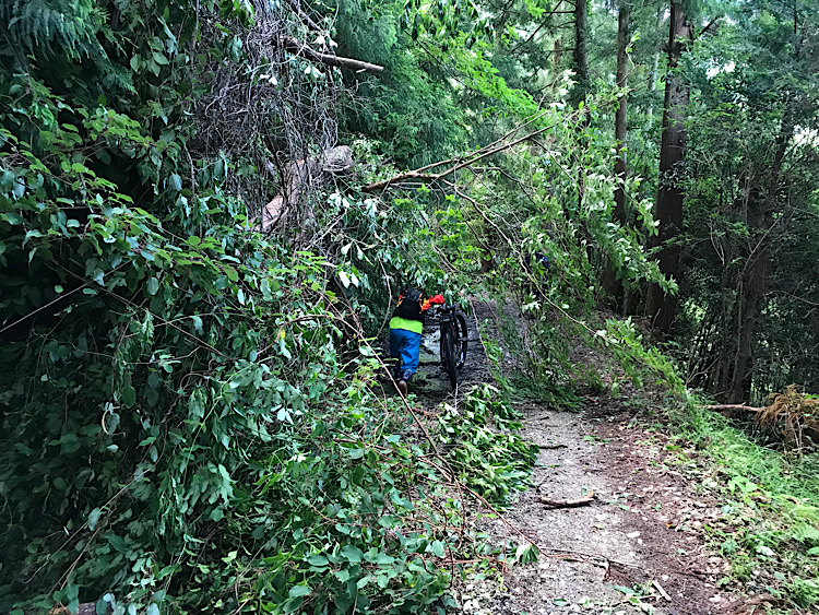 | 2021年5月23日現在の様子 天候不順が続きます。大荒れの日がありましたので、ルートの確認に行ってきました。 下の駐車場に車を置いて9:25出発です。 アプローチに当たる林道で倒木がありました。この辺りは主要な林道ですので復旧も早いでしょう。 くぐり抜けて先へ進みます。 1時間近くのんびりしてしまいました。 中上級者であれば、昼食無しの場合、11:30頃駐車場に戻ります。昼過ぎには自宅へ帰れますね。家庭を考えると、これ位のスケジュールが無理ないように思います。 E-Bikeの時短効果を感じられる1日でした。 |